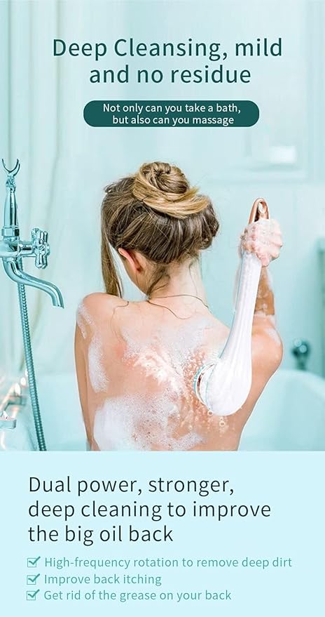 - 【Ergonomically Lengthened Handle】This electric shower brush is designed with a 14.6inch extended handle to help you reach your lower back and other hard-to-reach places. The handle is designed with side anti-slip strips and grooves, making it easy to grip and non-slip. The ergonomic curved brush head makes it more comfortable and efficient to use. Hooks can be used to store bath brushes, saving space.