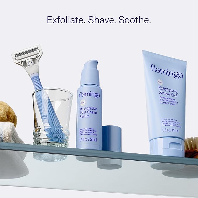 Flamingo Pubic Hair Shaving Skin Care Set, Exfoliating Shaving Gel for Women 5 fl oz with Restorative Post Shave Serum 1.7 fl oz