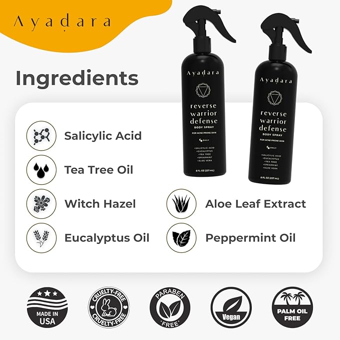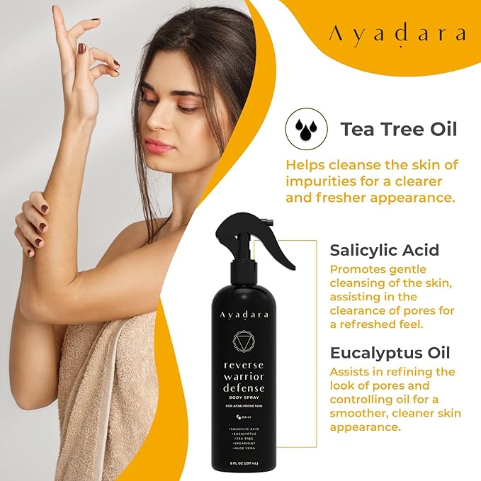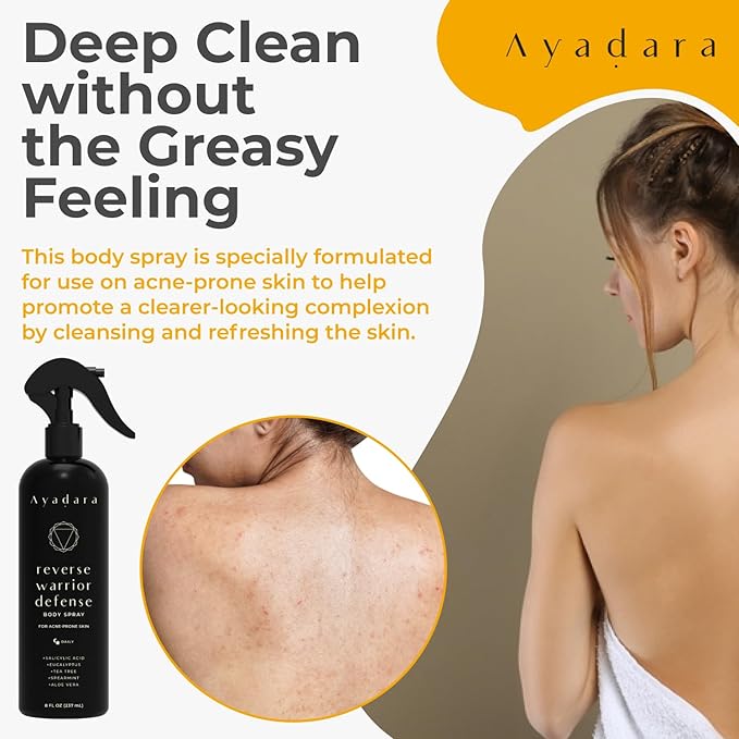 - Quick Drying bacne Spray: Get clear skin wherever you go with our bacne back spray. It takes just 1 spritz to quickly absorb into your skin, to keep bacne away. It has active salicylic acid and tea tree oil, to clear blocked pores, redness and itching.