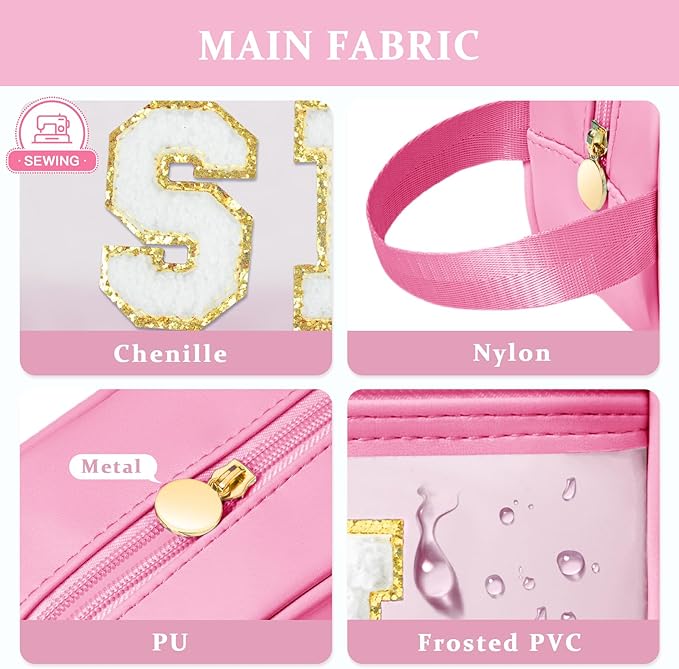 - [Cute Preppy Chenille Letter SEWN Embroidered on the Waterproof Semi-transparent Bag] Glitter sparkly puffy letters fixed firmly not peel off, reusable durable easy to clean; matte translucent bags for both convenience and privacy design, aesthetic preppy girly stuff for womens cruise air travel/business trips.