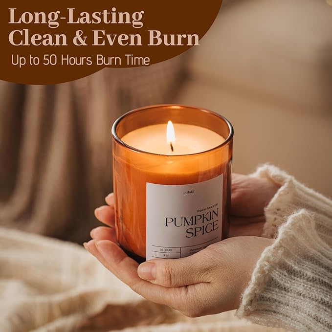 - 【Long Lasting, Clean & Even Burn】Putart's pumpkin soy candles feature lead-free cotton wicks for a stable, even burn that lasts up to 50 hours without emitting black smoke. This long burning autumn jar candle provides a delightful, enduring fragrance, perfect for homes, offices, bedrooms, or bathrooms. Whether for work, bedtime rituals, yoga, meditation, spa sessions, or baths, our candle creates an ideal atmosphere and delivers an immersive aromatic experience.
