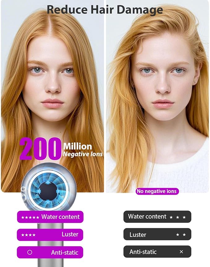 - ✅[Advanced Ionic Care for Silky-Smooth Hair] With the power of 200 million negative ions to deeply nourish your hair, repairing and protecting the cuticle layer for a healthier, shinier look. Say goodbye to frizz and tangles. Our hairdryer ha innovative technology attracts moisture molecules from the air, forming a protective layer on your hair to lock in hydration and enhance smoothness. With every use, your hair becomes silkier, softer and easier to manage—effortless great hair days every day