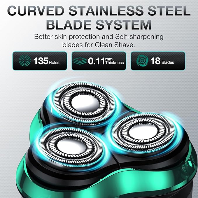 - 4D Floating Shave for Comfort:This Electric Razor for Men features 3 sets of 4D floating rotary heads with 18 self-sharpening blades and a high-speed motor. The curved shaving system adapts to the contours of your face, chin, and neck for a smooth, clean, and comfortable shave every time.