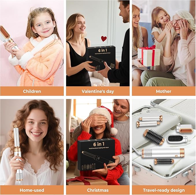 - 6 IN 1 BLOW DRYER BRUSH SET: The curling iron brush with attachments, 2* left/ right air hair curler wrap, 1* volumizing hot air brush, 1* hair straightening brush, 1*hair dryer head suitable for create volumizing, drying, straightening, curling hair. The negative ion 6 in 1 hair styler low heat hair care ensures that your hair is dried gently and evenly, preserving its natural shine and health.