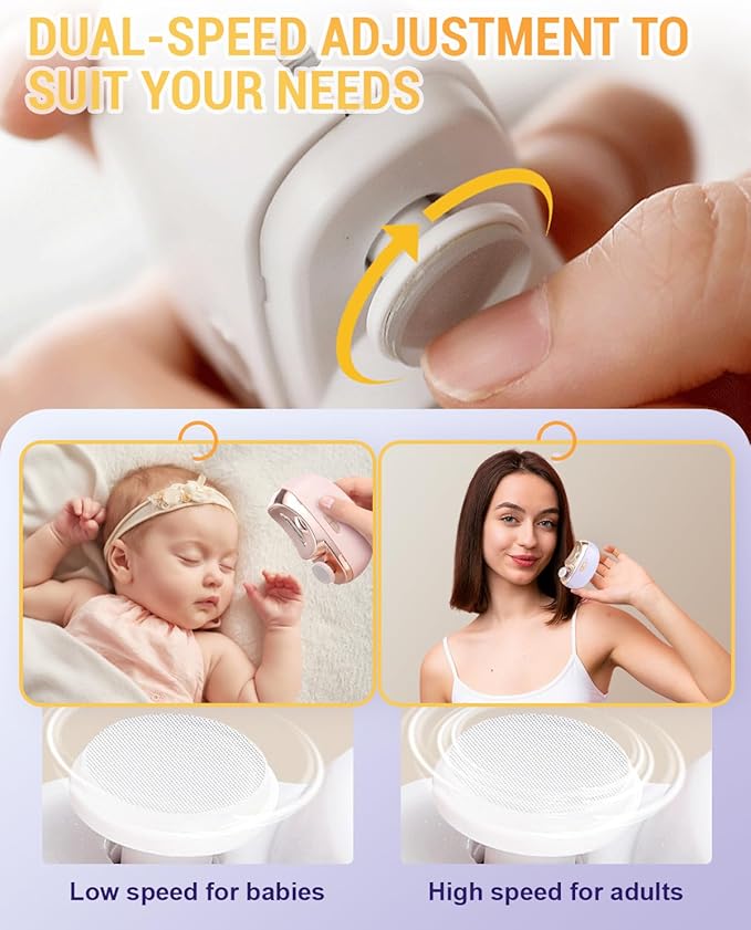 - 【Safe and Convenient】One-button operation, two-speed adjustment, convenient and comfortable to use. The quiet motor and auxiliary light allow you to trim your baby’s nails while they sleep without disruption, or trim nails safely in dimly lit places.