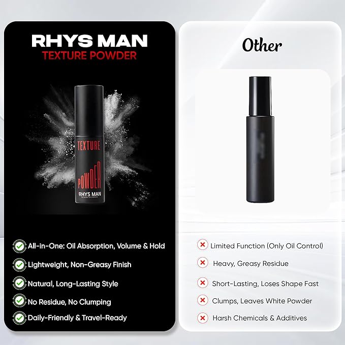 - VOLUMIZING TEXTURE POWDER for Men – Instantly adds natural lift and fullness to flat or lifeless hair. Designed for short to medium lengths, it boosts volume at the roots with a lightweight, fluffy finish without heaviness, stiffness, or greasy residue